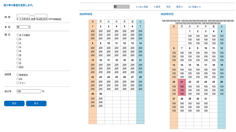 お客様の希望日に対して、システム内で土日祝日や閑散期の金額設定に基づき、前後1週間(計14日文)の料金定時が可能です。