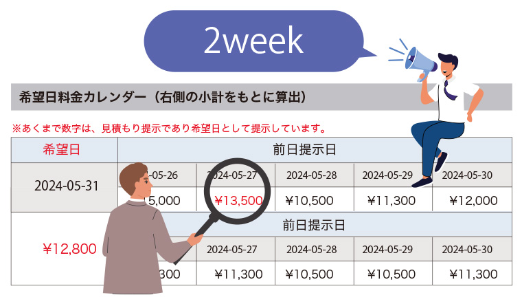 お客様が指定した引越し希望日に対し、その前後1週間(合計14日間)の料金を一括で提示できる機能を搭載しています。